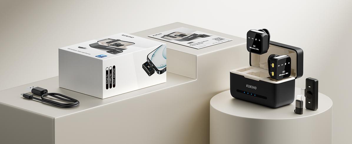 Packing list: Charging Compartment *1, Type-C Receiver *1, Microphone *2, Apple Adapter (Rechargeable) *1, Manual *1, Charging Wire *1, Color Box *1